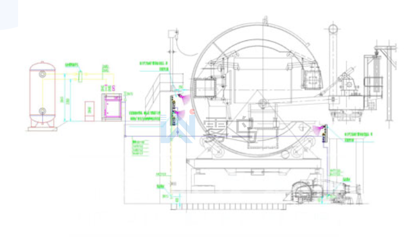翻車機的微米級干霧抑塵系統由水箱、多級過濾恒壓供水站、空氣壓縮機、儲氣罐、微米級干霧抑塵主機、干霧箱控制器、噴霧箱、霧化管道、集中控制系統、配電箱等組成。 在翻車機傾翻側上面安裝5套ST2-7-60干霧箱總成,1套STK-A干霧箱控制器,1套STK-W干霧箱控制器,在傾翻側下面安裝3套ST2-7-60干霧箱總成,1套STK-A干霧箱控制器,1套STK-W干霧箱控制器,在背翻側設計安裝6套ST2-7-60干霧箱總成和1套SKT-A干霧箱控制器、1套SKT-W干霧箱控制器,干霧箱總成噴霧時間30s,周期2min。