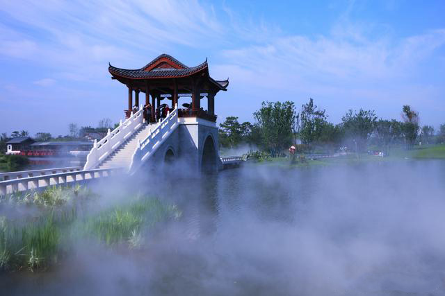 霧森系統(tǒng)沿湖安裝,一旦開(kāi)啟,那霧在湖面上蔓延,微風(fēng)吹拂,推著霧,一忽移動(dòng),一忽停滯,一忽凝聚,一忽散開(kāi)……如夢(mèng)、如幻、如詩(shī)、如畫(huà),揮不走,扯不開(kāi),斬不斷,擋住了視線,使人有種飄飄然乘云欲歸的感覺(jué)。